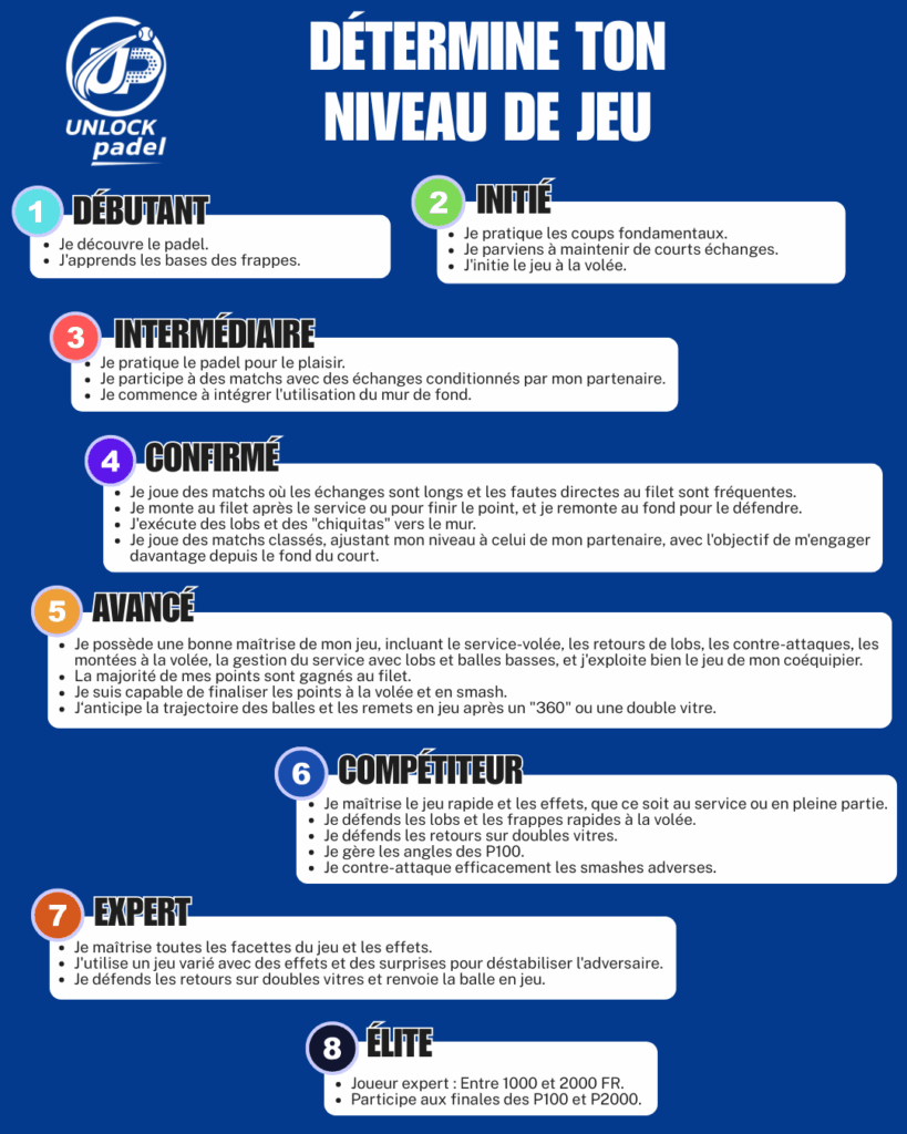 Je possède une bonne maîtrise de mon jeu, incluant le service-volée, les retours de lobs, les contre-attaques, les montées à la volée, la gestion du service avec lobs et balles basses, et j’exploite bien le jeu de mon coéquipier.